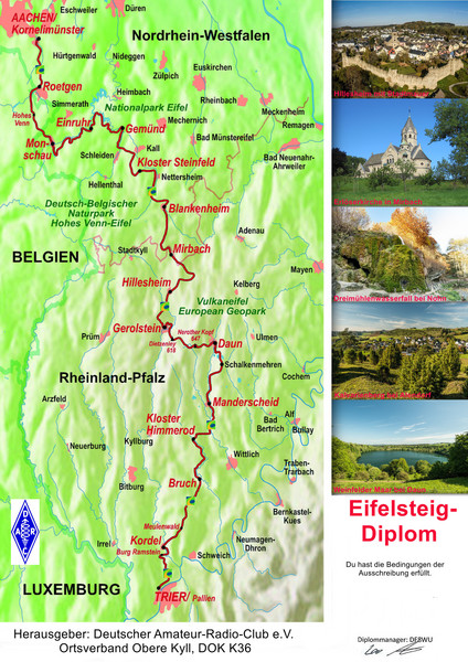 Der DARC Ortsverband K36 Obere-Kyll gibt das Eifelsteig-Diplom heraus. Es kann von allen lizensierten Funkamateuren und SWL ́s beantragt werden. Es werden alle Verbindungen ab dem 01.01.2009 gewertet. Zur Erlangung des Diploms müssen bestimmte Punktzahlen erreicht werden. Es zählen nur Verbindungen mit Stationen aus den entlang des Eifelsteigs liegenden DOK ́s in den Betriebsarten SSB, CW und Digi-Modes.