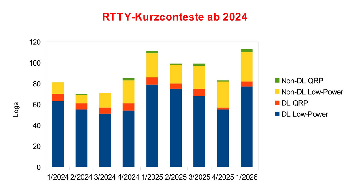 Der zweite Dienstag im Januar 2026 war der Start in die mittlerweile vierte Saison der RTTY-Kurzconteste. Die Beteiligung war die bisher höchste seit Einführung des Wettbewerbs in der zweiten Jahreshälfte 2023. Sagenhafte 115 Wertungslogs plus 6 Checklogs waren es diesmal, die von den Teilnehmern hochgeladen wurden. Ein Log musste aus der Wertung genommen werden, es waren schlicht alle geloggten Uhrzeiten falsch. Zwei Teilnehmer wurden mit Punktabzügen belegt, sie hatten auf das Senden von RST verzichtet und sich so (wegen der Zeitersparnis, die in einem Kurzcontest nicht zu unterschätzen ist) einen Vorteil verschafft, der geahndet werden musste.