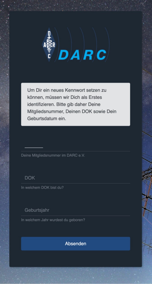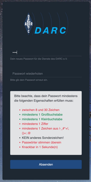 E-Mail-Adressen, die auf @darc.de enden, werden nicht für die Rücksetzung berücksichtigt, da wir davon ausgehen, dass Sie auch keinen Zugriff auf ihr DARC-Email-Postfach haben.