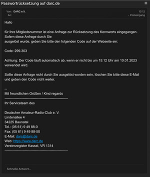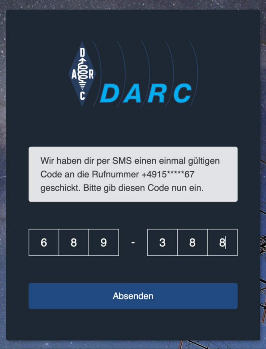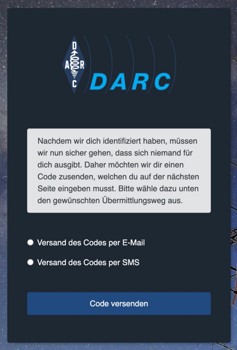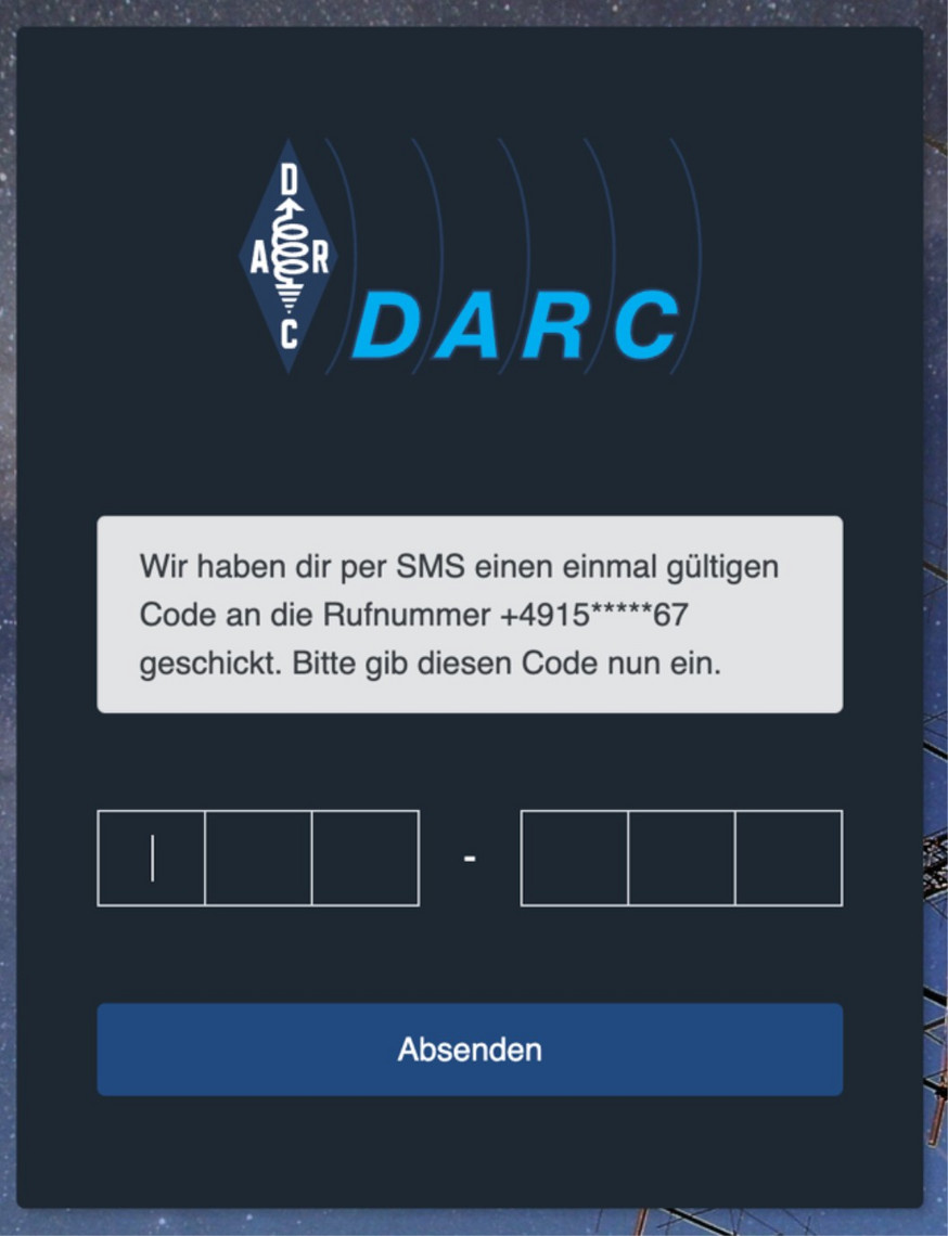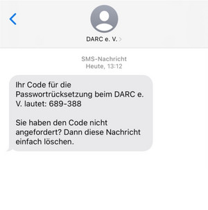 Mit diesem Code verifizieren wir, dass die Anfrage wirklich von ihnen und nicht von einem unbefugten Dritten stammt. Der versendete Code wird zufällig generiert, ist nur zur einmaligen Nutzung freigeschaltet und verliert nach 2 Stunden automatisch seine Gültigkeit. Der Absender der versendeten E-Mail ist ‚DARC e.V. <darc@darc.de>‘ und die versendete SMS kommt vom Absender ‚DARC e.V.‘ ohne Rufnummer.