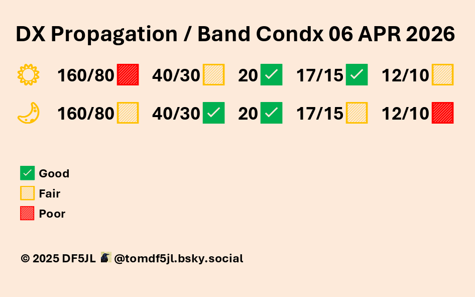 Der solare Fluxindex (SFI) wird wahrscheinlich bis mindestens zum 26. April bei 85 oder höher bleiben, aufgrund von zwei aktiven Regionen auf der Sonnenoberfläche, 2816 und 2817, die insgesamt 16 Sonnenflecken enthalten. Es wird erwartet, dass im Laufe dieser Woche zwei weitere aktive Sonnenregionen auf der sonnenabgewandten Seite der Sonne in Sicht kommen, was den SFI möglicherweise erhöht und die verstärkte Ausbreitung mindestens bis Ende April verlängert.