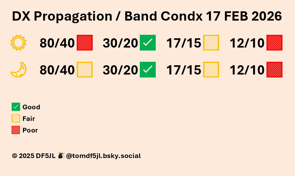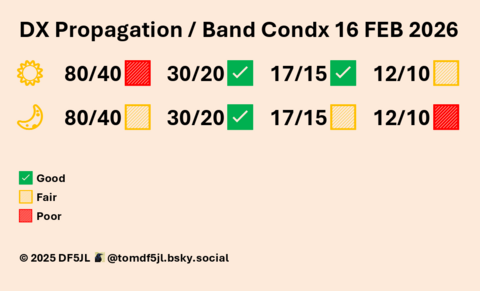 Die geomagnetische Aktivität ist unbeständig bis aktiv, mit der Möglichkeit weiterer vereinzelter kleinerer G1-Stürme. Die Sonnenaktivität ist gering, wenig Änderung in Sicht (M 10% X 01% Proton 01%). Gemischte HF-Bedingungen. ZCZC 170530UT FEB26 QAM SFI118 SSN69 eSFI112 eSSN66 KIEL A27 K(3H)2 SWS623 BZ0 BT5 HPI15 DST-3 KP4CAST(3D) MAX 5 3 3 MUF3000 MAX24+(D) MIN5(N) DATA BY SWPC/NOAA SANSA WDC/KYOTO MET OFFICE UK GFZ POTSDAM FWBST RHB NNNN