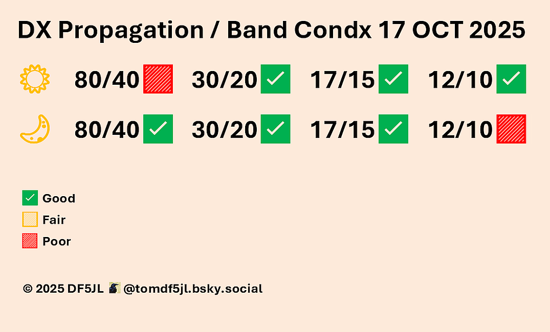 Vorhersage bis 21. Oktober: Laut NASA erwarten wir etwa konstante Fluxwerte zwischen 140 und 150 Fluxeinheiten. Weitere M-Flares sind zu 50 Prozent wahrscheinlich. Das geomagnetische Feld bleibt unruhig. Obwohl für das kommende Wochenende, an dem unser WAG-Contest stattfindet, ein ruhiges Erdmagnetfeld mit k =2 vorhergesagt wird, ist die Ankunft von koronalen Plasmawolken einer CME vom 11. Oktober wahrscheinlich. Lassen wir uns überraschen. Die oberen Bänder 20 m und 15 m sollten tagsüber gut öffnen. Nachts sind 80, 40 und stundenweise 20 m brauchbar.