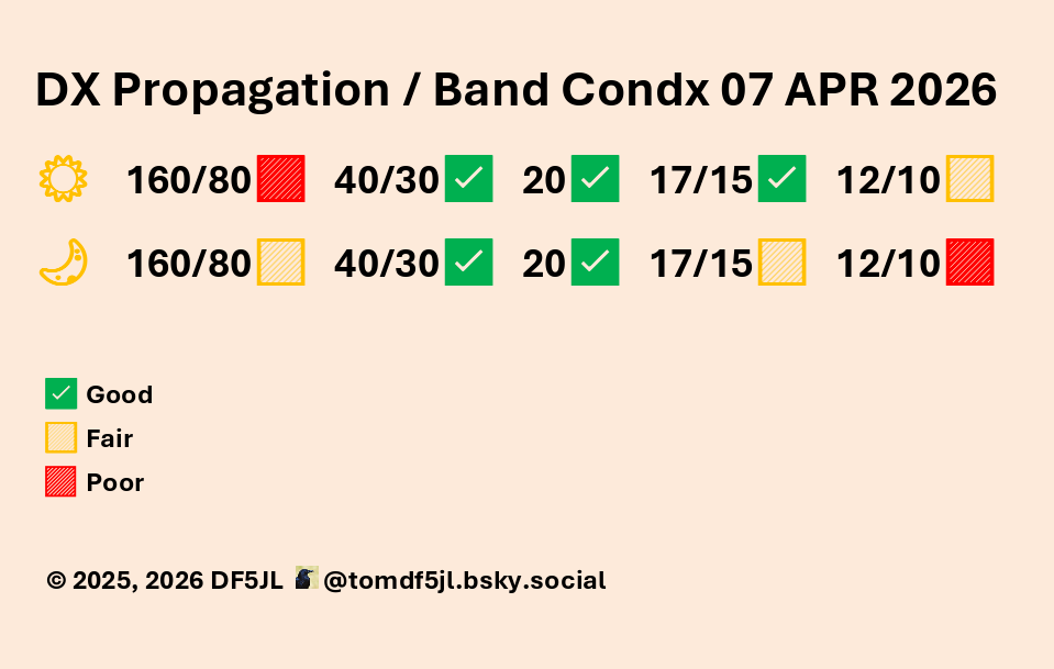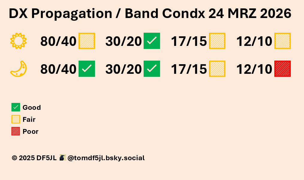 Vorhersage bis 4. Mai: Gegenwärtig liegen die Regionen 2818, 2820 und 2821 dicht beieinander. Ein M-Flare und weitere C-Flares sind bis zum 1. Mai möglich. Nachdem die aktiven Regionen die uns zugewandte Sonnenseite verlassen haben, werden die Fluxwerte wieder sinken, zumal im "Farside-Monitor" keine neuen Sonnenflecken sichtbar sind [5]. Wir erwarten nur geringe geomagnetische Störungen mit maximal k = 3. Tagsüber ist die Fernausbreitung auf den Bändern 20 und 17 m normal. Mittags ist auch das 15-m-Band in östliche und südliche Richtung offen. Nachts sind auf 40 und 30 m laute DX-Signale präsent. Aktuelle Funkwettermeldungen findet man auch bei "Daily-DX" [6].