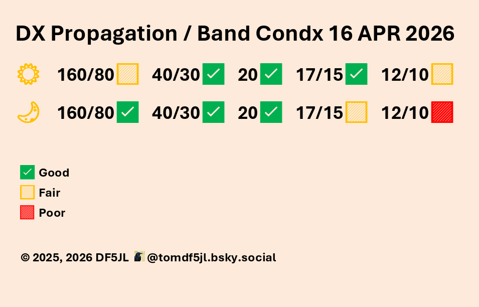 Der solare Fluxindex (SFI) wird wahrscheinlich bis mindestens zum 26. April bei 85 oder höher bleiben, aufgrund von zwei aktiven Regionen auf der Sonnenoberfläche, 2816 und 2817, die insgesamt 16 Sonnenflecken enthalten. Es wird erwartet, dass im Laufe dieser Woche zwei weitere aktive Sonnenregionen auf der sonnenabgewandten Seite der Sonne in Sicht kommen, was den SFI möglicherweise erhöht und die verstärkte Ausbreitung mindestens bis Ende April verlängert.