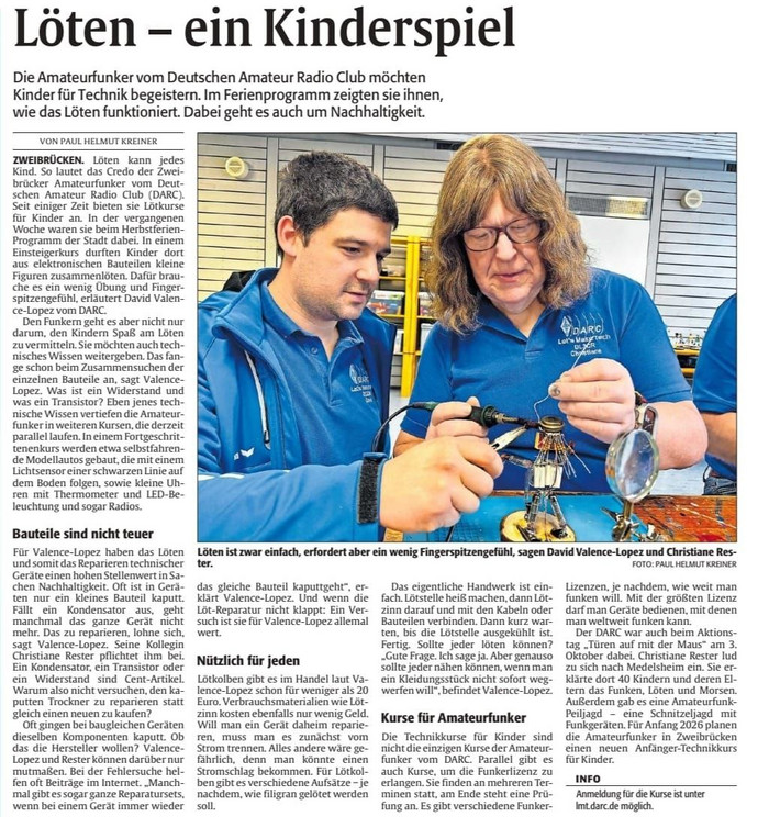 Im Rahmen der Kindererlebniswoche des Stadtjugendamtes Zweibrücken konnte 65 Kindern während der Sommerferien ein ganz besonderes Erlebnis geboten werden. Denn die Funkamateure des DARC (Deutscher Amateur Radio Club e.V.) hatten sich zum Ziel gesetzt, Kinder und Jugendliche an das Thema Technik heranzuführen und konnten dazu verschiedene Projekte anbieten. Ende Juli wurden an der Westpfalzhalle dazu fünf Stationen vorbereitet, die die Kinder im Laufe des Tages durchlaufen konnten.