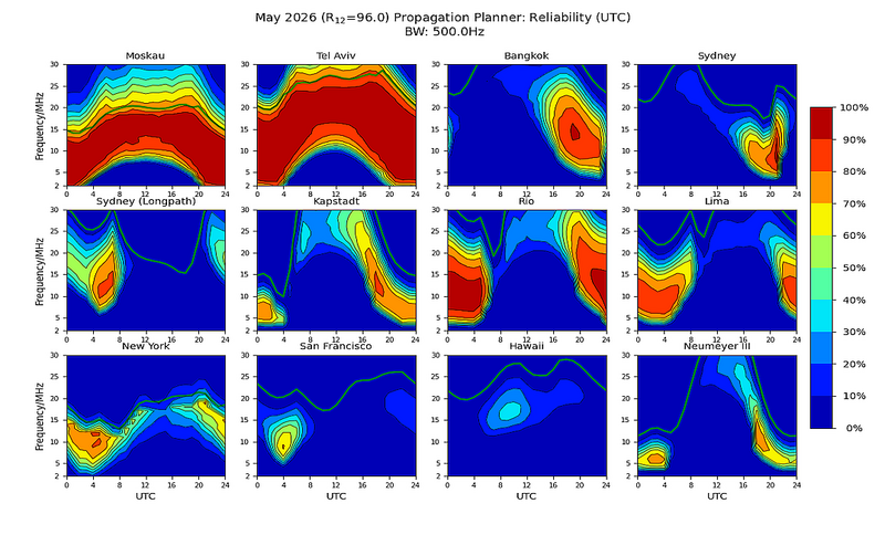 Ausgehend von einer Sonnenfleckenrelativzahl von 96 zeigt die Übersicht die Zuverlässigkeit (Reliability) von Funklinien (DL - Zielgebiet) in Prozent (Morsetelegrafie; TX 50 Watt, RX 500 Hz Bandbreite, SNR = 0 dB).