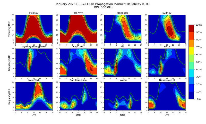 ... erstellt mit dem Webtool "Proppy": soundbytes.asia/proppy/. Die von dieser Webanwendung bereitgestellten Funktionen ermöglichen es Benutzern, verfügbare Frequenzen, Signalpegel und entsprechende Zuverlässigkeiten für versch. Ausbreitungswege vorherzusagen. Alle Vorhersagen werden mit der ITURHFPROP-Anwendung der ITU durchgeführt, einer Softwaremethode zur Vorhersage gemäß der Empfehlung ITU-R P.533-14.