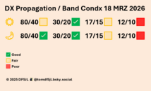 Die geomagnetische Aktivität wird überwiegend ruhig sein, am Donnerstag stürmisch (Kp 5-6) aufgrund einer CME. Die Sonnenaktivität ist gering, mit vereinzelten M-Flares ist zu rechnen (M 35 % X 05 % Proton 05 %). Brauchbare, teils gute HF-Bedingungen. - ZCZC 180530UT MRZ26 QAM SFI111 SSN72 eSFI108 eSSN60 KIEL A6 K(3H)1 SWS423 BZ1 BT5 HPI16 DST14 KP4CAST(3D) MAX 2/3 6 5 MUF3000 MAX24+(D) MIN9(N) DATA BY SWPC/NOAA SANSA S-AFRICA WDC/KYOTO MET OFFICE UK KMI DOURBES GFZ POTSDAM NNNN
