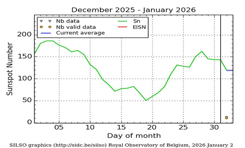 Die durchschnittliche Sonnenfleckenzahl lag das ganze Jahr über stabil über 100 und übertraf damit viele Prognosen; Forscher diskutierten aufgrund der intensiven November‑Ereignisse über ein mögliches doppeltes Maximum des Zyklus. Nach einem deutlichen Aktivitätsrückgang Mitte Dezember setzte in der zweiten Monatshälfte erneut ein Anstieg ein, sodass die Hoffnung besteht, dass die Sonnenaktivität auch 2026 relativ hoch bleiben könnte.