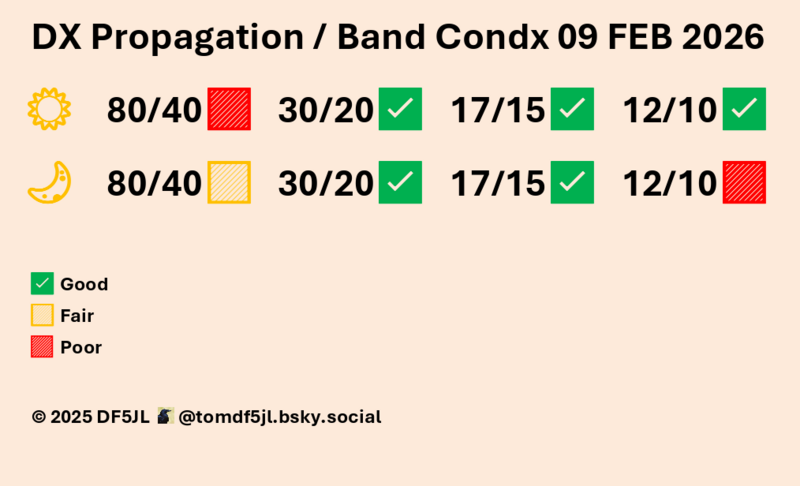 Die geomagnetische Aktivität dürfte zunächst ruhig sein, dann aber allmählich zunehmen (Kp 2-4). Die Sonnenaktivität ist mäßig, mit vier M-Flares innerhalb der letzten 24 Stunden. Weitere Flareausbrüche werden erwartet (M 65% X 25% Proton 25%). Überwiegend gute HF-Bedingungen.