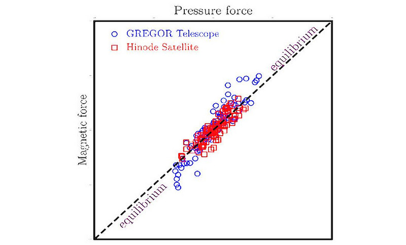 Abb.: Magnetische Kraft (vertikale Achse) gegenüber der Druckkraft (horizontale Achse) in einem Sonnenfleck, der mit dem deutschen 1,5-Meter-Sonnenteleskop GREGOR (blaue Kreise) beobachtet wurde. Daneben derselbe Sonnenfleck, beobachtet mit dem japanischen 0,5-Meter-Satelliten Hinode (rote Quadrate) . Die schräge gestrichelte Linie stellt die Gleichgewichtslinie dar, bei der Druckkraft gleich magnetische Kraft ist. Alle Datenpunkte befinden sich entlang dieser Gleichgewichtslinie, was darauf hindeutet, dass sich der Sonnenfleck im Gleichgewicht befindet und somit stabil ist.
