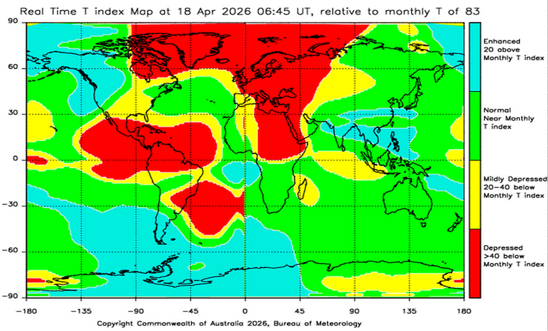 Tipp: Unter https://www.sws.bom.gov.au/HF_Systems/6/9 wird eine Karte angezeigt, die die T-Index-Differenz in nahezu Echtzeit anzeigt. Die Differenzen werden berechnet, indem der prognostizierte monatliche T-Index für die globale Ionosphäre vom beobachteten T-Index abgezogen wird. Der beobachtete T-Index wird aus den foF2-Beobachtungen berechnet. Die Karten der letzten 7 Tage können über die Schaltflächen unterhalb des Bildes aufgerufen werden.