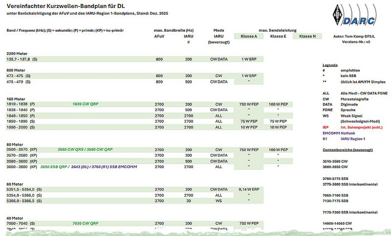Durch das Zusammenführen der wichtigsten Angaben aus AFuV und IARU-Bandplan entstand eine übersichtliche Unterlage, die als Basisinformation ausgedruckt auf dem Stationstisch oder im Rucksack ihren Platz finden wird. Der vereinfachte KW-Bandplan eignet sich auch für Besucher aus dem Ausland, um sich schnell einen Überblick über die Belegung der Kurzwellenbänder in Deutschland zu verschaffen.
