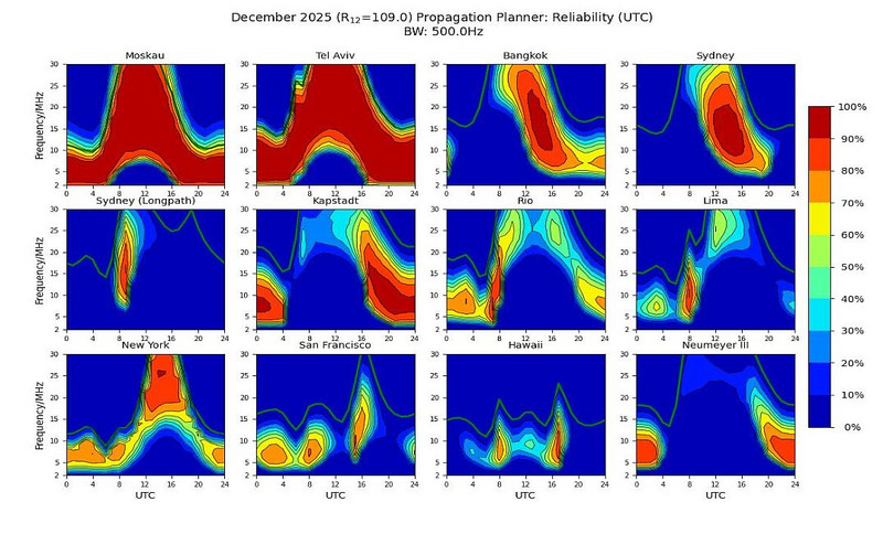 Die Vorhersage wurde mit dem Webtool Proppy erstellt. Diese Webanwendung ermöglicht es Benutzern, verfügbare Frequenzen und entsprechende Zuverlässigkeiten für Verbindungen je nach Zielgebiet vorherzusagen. Alle Vorhersagen werden mit der ITURHFPROP-Anwendung der ITU durchgeführt, einer Softwaremethode zur Vorhersage gemäß der Empfehlung ITU-R P.533-14.
